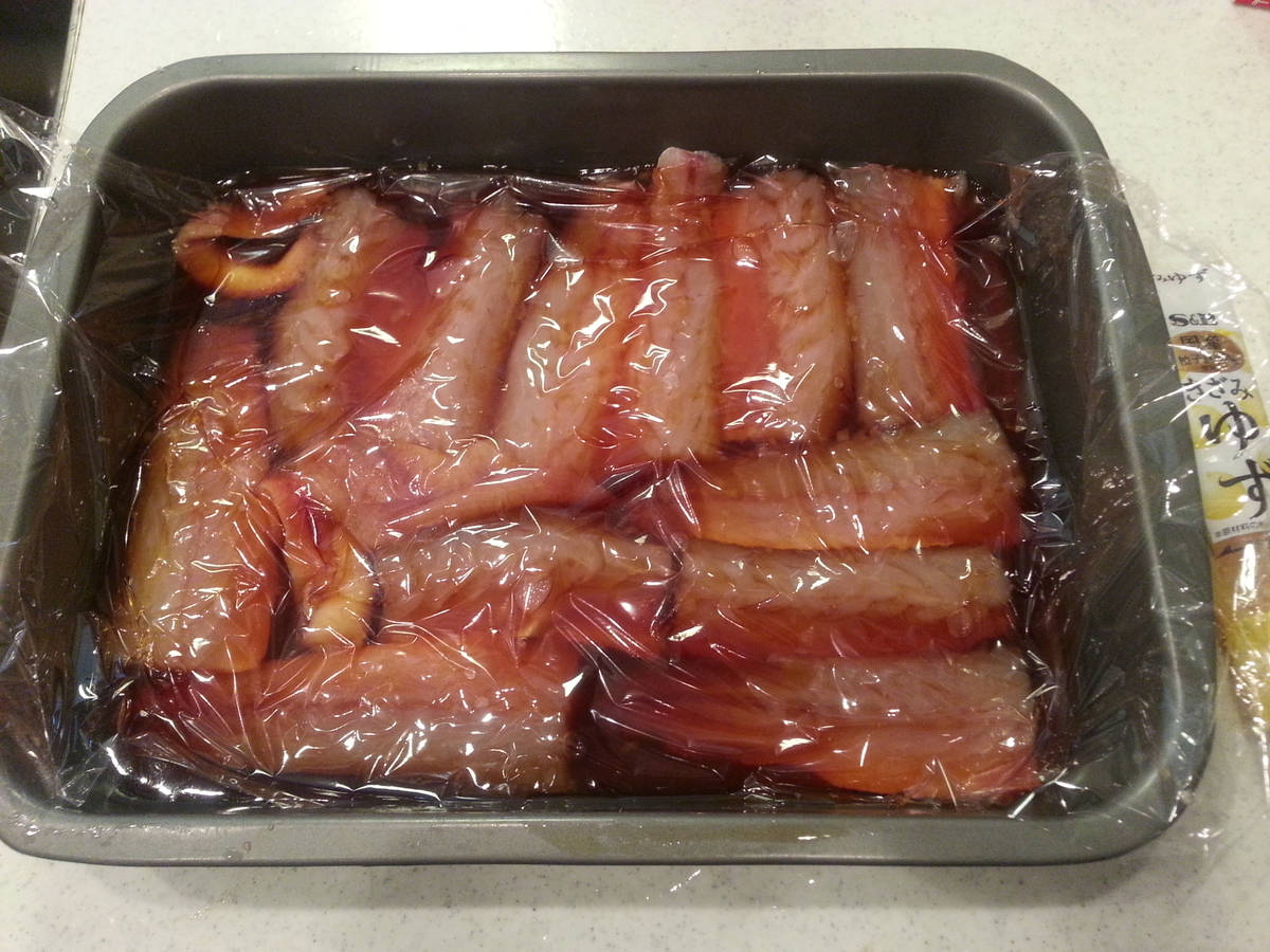 カマスを漬けダレに20分以上、漬け込みます。お腹の中に入っていた卵も一緒に漬け込みました。