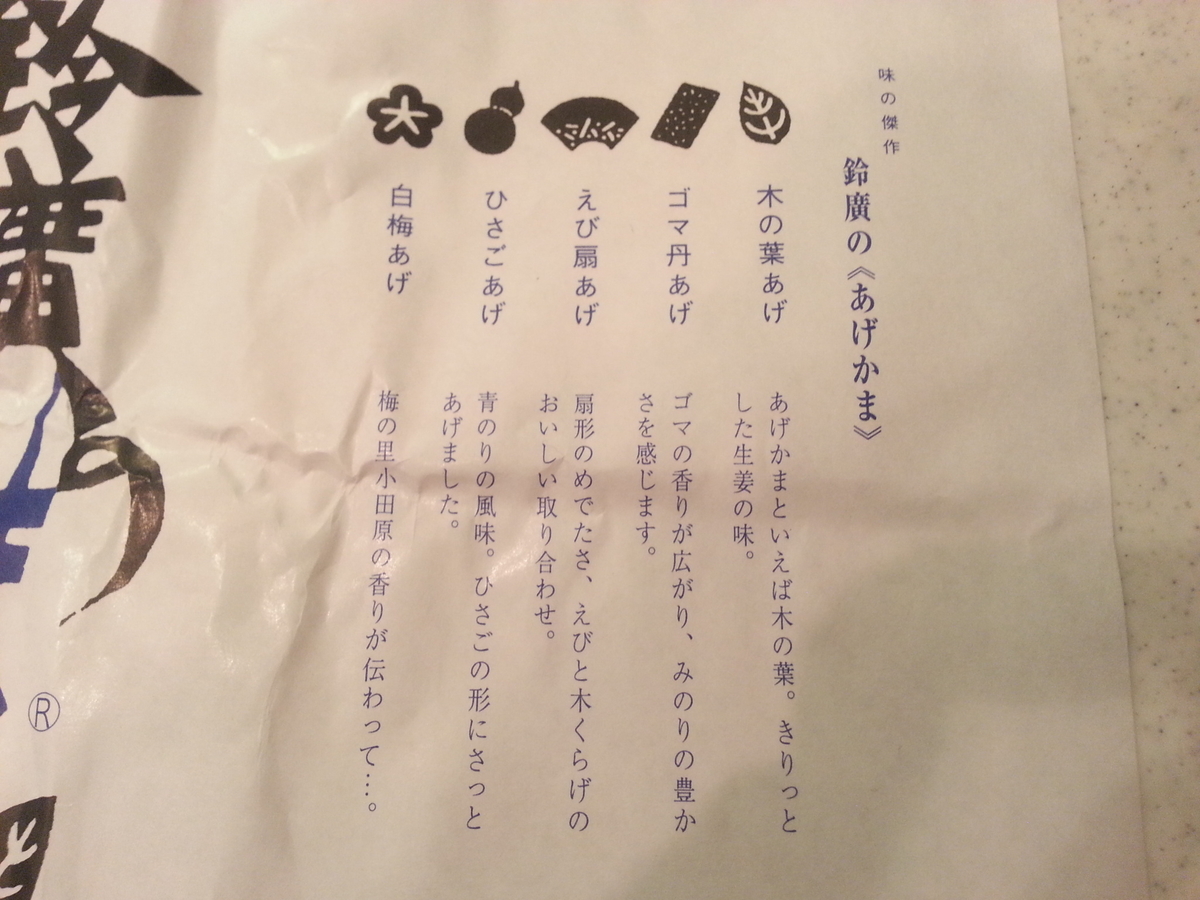 パック1つを開封しました。あげかま5種で御座います。なんと言ってもこの見た目ですよ。味の違いもさることながら、木の葉・扇・梅などと、「見て楽しい」要素も織り込んでくれています。