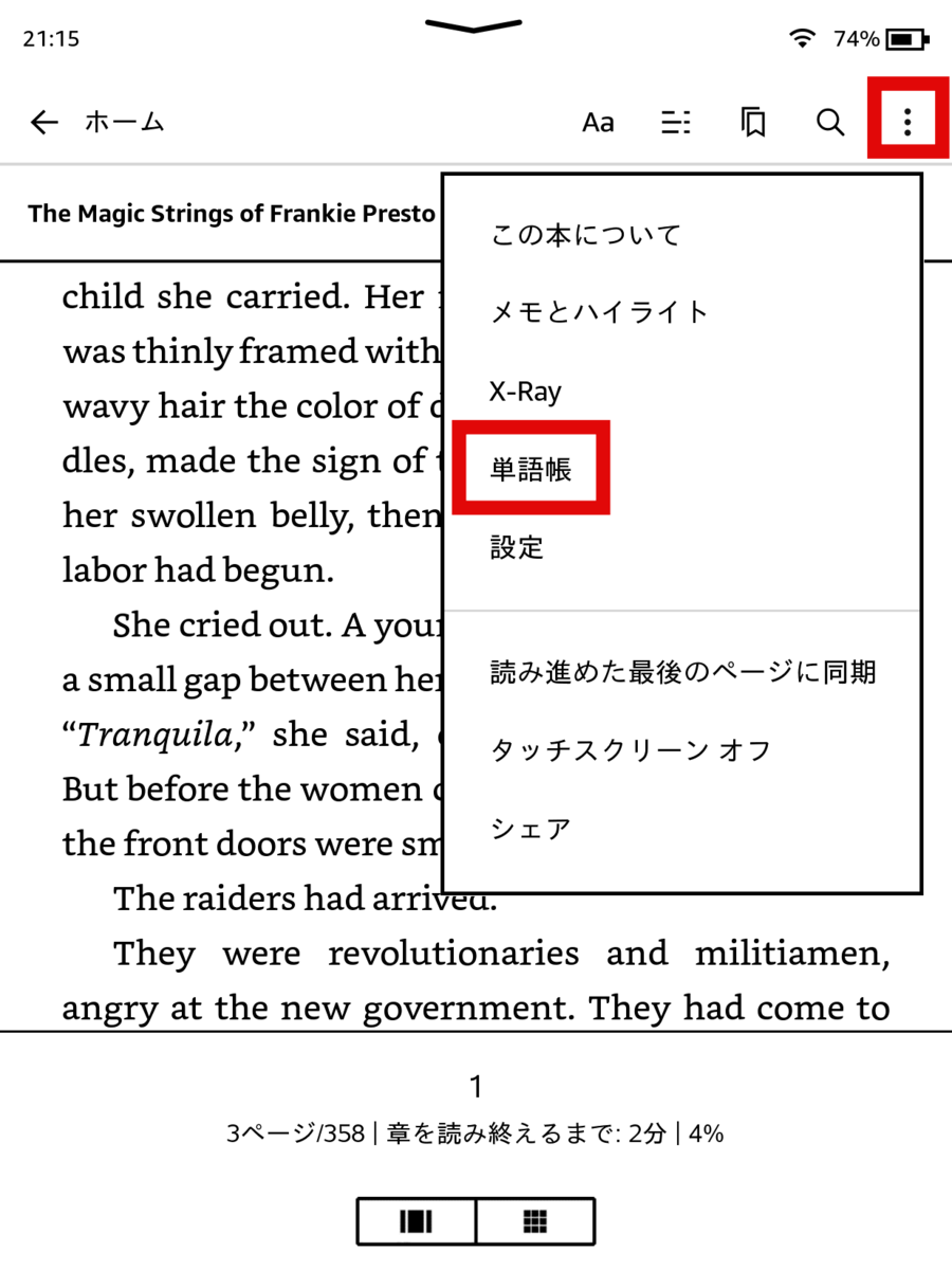 ▼それでは先ず、今読んでいる洋書Kindleのスクリーン上でタッチします。