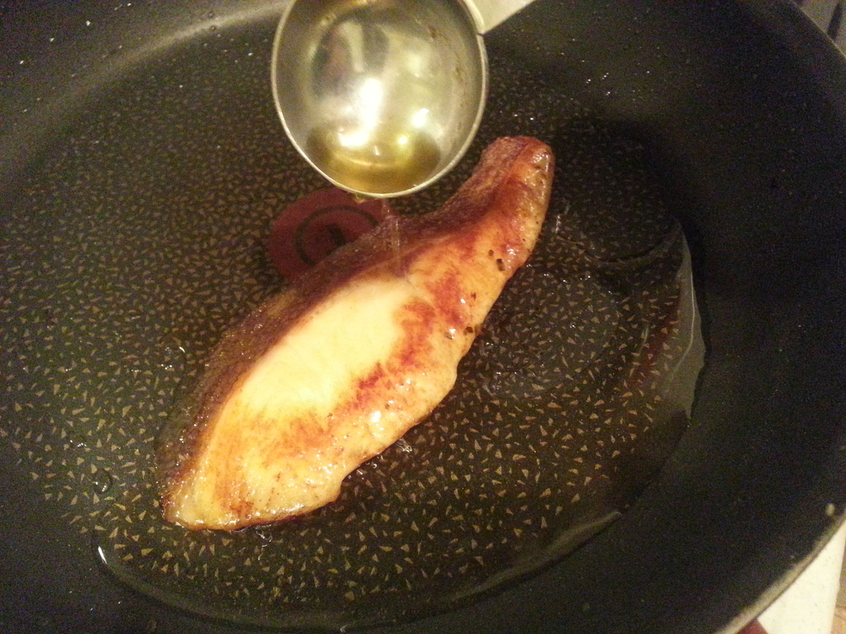 裏返したら、油を回し掛けながら、2分焼き上げます。